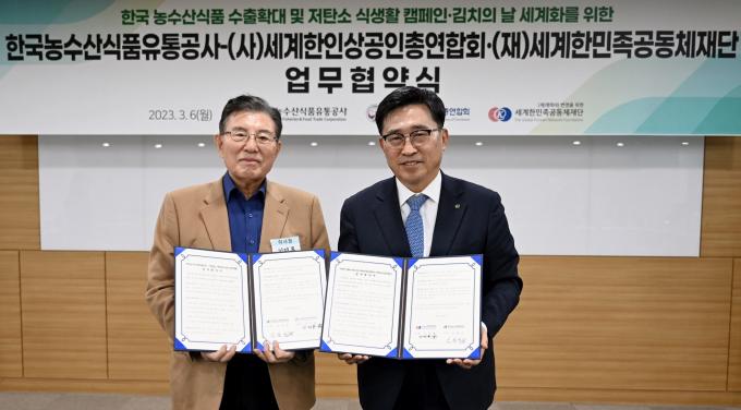 한국 농수산식품 홍보와 수출확대 협력 다짐 한국농수산식품유통공사가 (사)세계한인상공인총연합회, (재)평화와번영을위한세계한민족공동체재단과 업무협약을 체결하고 K-푸드 수출 확대와 한식 세계화에 노력하기로 했다고 6일 밝혔다.