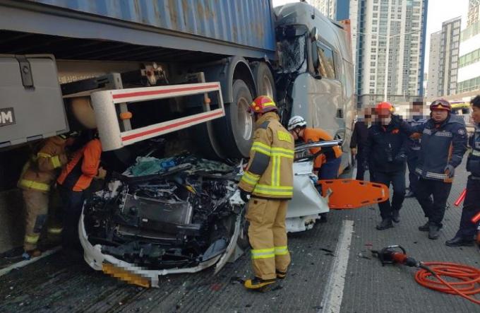 경찰에 따르면 이날 오후 4시 7분께 편도 2차로인 이 도로에서 60대 운전사가 몰던 트레일러가 신호대기 중인 택시를 들이받았다. 사고 여파로 앞서 신호 대기 중이던 다른 트레일러 3대와 승용차도 연쇄 추돌했다.