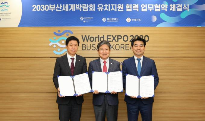이날 협약식에는 이성권 부산시 경제부시장, 윤상직 유치위원회 사무총장, 이갑 롯데지주 커뮤니케이션실장이 참석했다.