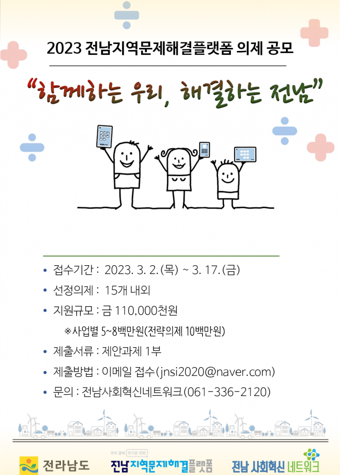 지역 문제 해결에 관심 있는 도민이나 단체·기관은 전남도 대표 누리집 고시․공고나 전남사회혁신플랫폼 누리집 공지사항에서 신청 방법 등을 확인한 뒤 전자우편으로 제안과제 신청서를 제출하면 된다.