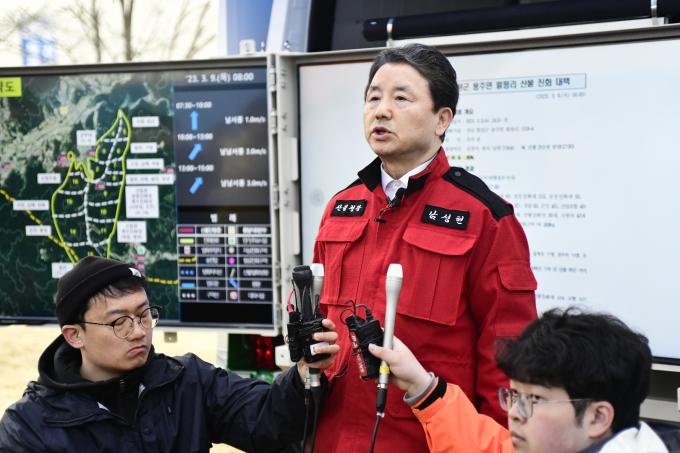 남성현 산림청장은 9일 오전 산불 현장지휘소에서 브리핑을 갖고 "밤새 특수진화대와 전문인력을 투입해 산불 진화에 총력전을 벌였다"며 "주불 진화 완료는 잔불 정리 직전이 될 것"이라고 말했다.