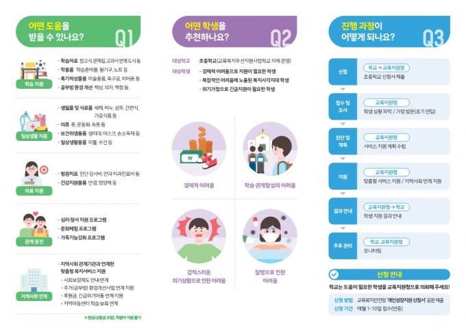 유상조 교육복지과장은 "도움이 필요한 학생들이 빠지는 사례가 없도록 지역사회와 연계하여 촘촘한 안전망을 구축하는 데 최선을 다하겠다"고 말했다.