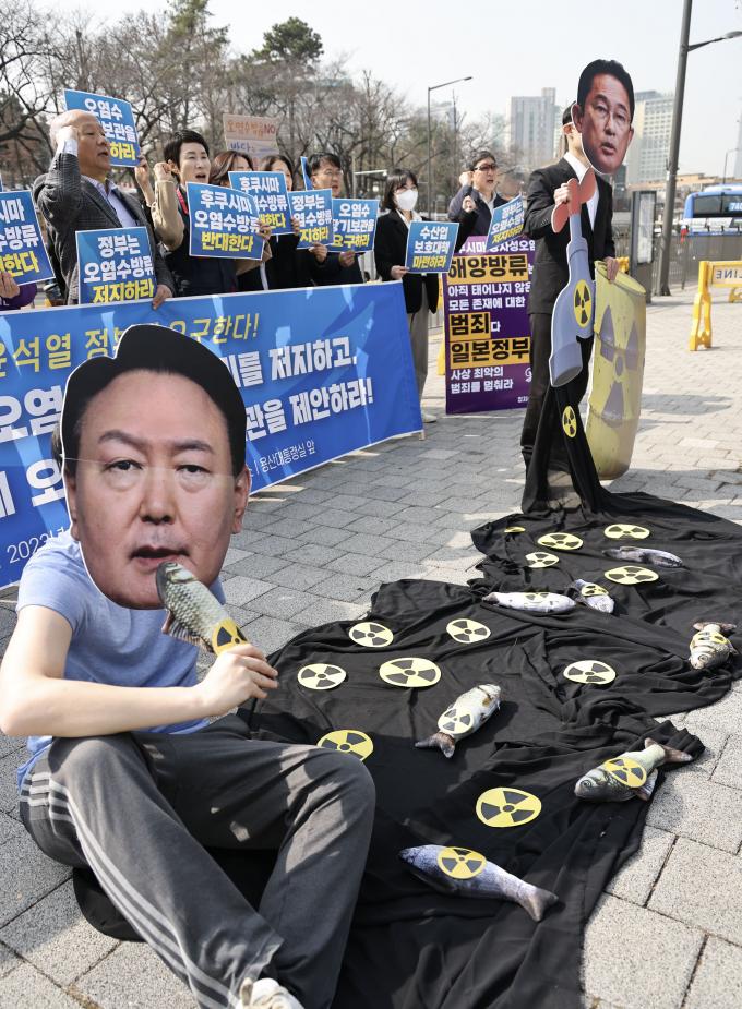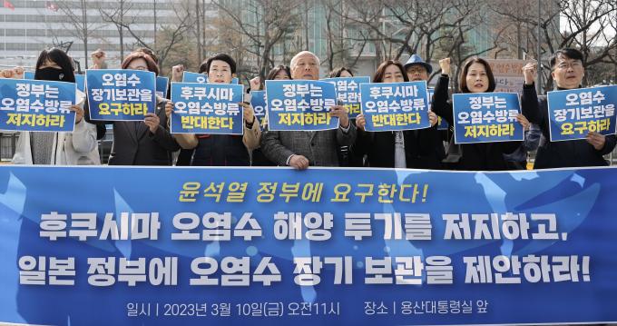 일본 방사성 오염수 방류 저지 공동행동 활동가들이 10일 오전 서울 용산 대통령 집무실 앞에서 '윤석열 정부는 일본 정부에 후쿠시마 방사성 오염수 장기보관을 요구하라!' 기자회견을 열었다.