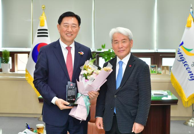 ▲노동일(오른쪽) 전남사회복지공동모금회 회장이 김한종 장성군수에게 감사패를 전달한 뒤 기념사진을 찍고 있다. [장성군 제공]