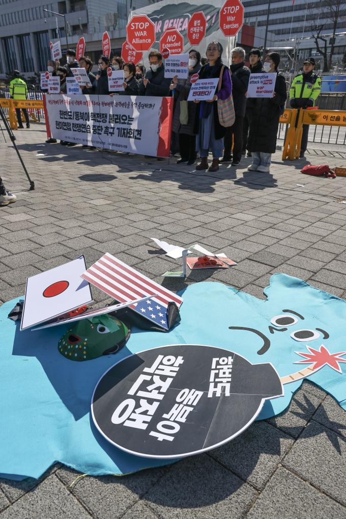 13일 오전 서울 용산 대통령 집무실 앞에서 '한반도·동북아 핵전쟁 불러오는 한미연합 전쟁연습 중단 촉구 기자회견'이 열렸다.