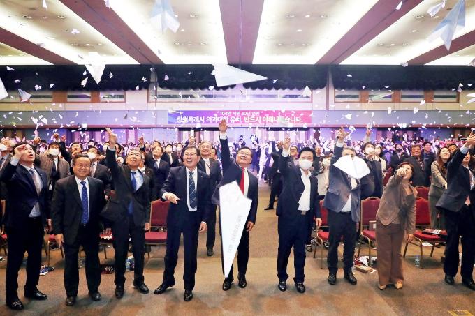 궐기대회와 공동위원장들의 대정부 건의문 서명에 이어, 참석자들은 희망 종이비행기 날리기 세리머니를 통해 의과대학 유치 성공을 기원했다.