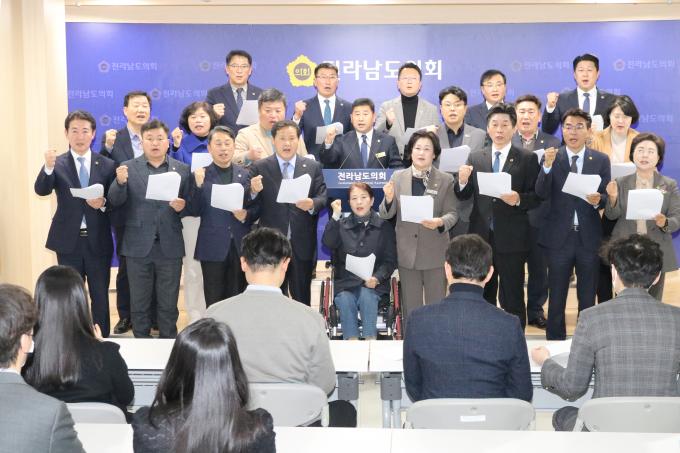 전남도의원들은 도의회 브리핑룸에서 기자회견을 열고 이번 감사는 "대한민국의 발전과 미래를 보지 못하고 전 정권 죽이기의 연장선에 있는 정치적 감사다"고 규탄했다.