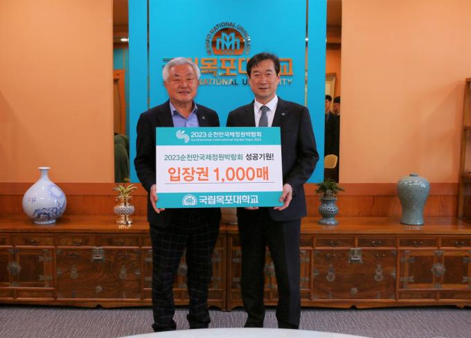 목포대학교 송하철 총장은 지난 13일 개막 20여 일을 앞두고 사전 입장권을 구매한 뒤 (재)순천만국제정원박람회조직위원회 천제영 사무총장에게 구매증서를 전달했다.