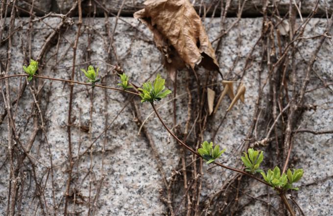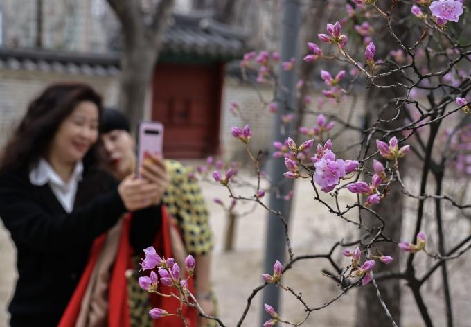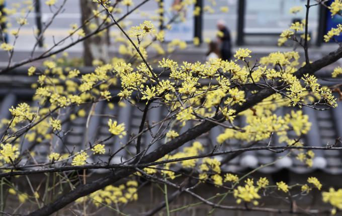 전국이 구름 많은 가운데 남부지방에는 낮 기온이 20도를 넘나드는 포근한 봄 날씨가 이어진 15일 바람이 불어 쌀쌀하게 느껴지지만 서울 도심 곳곳 양지바른 곳에서는 봄기운이 서서히 모습을 드러내고 있다.