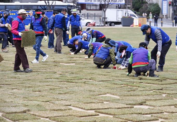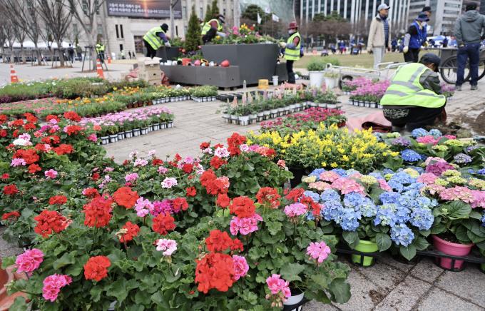 덕수궁 경내에는 노란 산수유가 활짝 피어 담장 밖을 지나가는 행인들의 시선을 사로잡는다. 겨우내 스케이트장으로 쓰던 시청광장에는 인부들이 새롭게 잔디를 심어 봄을 맞을 준비를 하고 있고, 그 옆 화단에는 예쁜 꽃들을 심느라 분주하다.