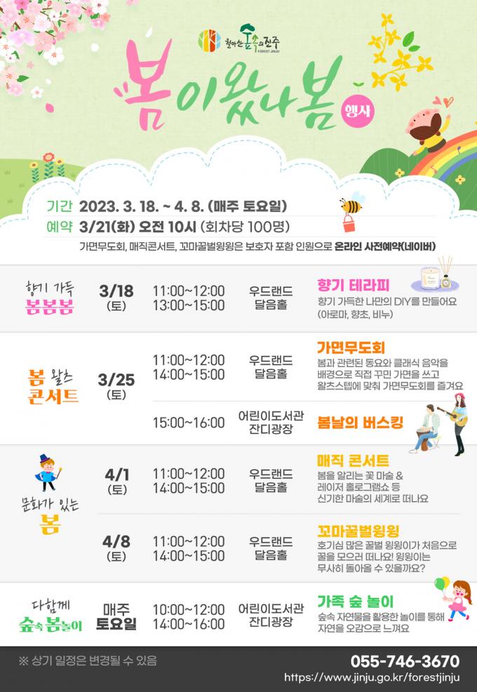 문화공연 중 가면무도회, 매직콘서트, 꼬마꿀벌윙윙은 회당 100명씩 사전예약을 받는다. 관람 신청은 월아산 숲속의 진주 네이버 예약에서 가능하다.