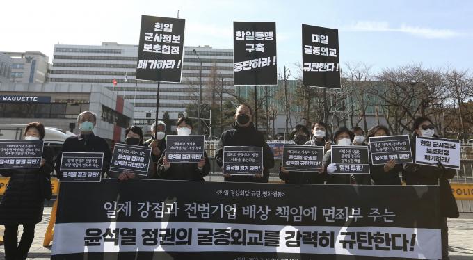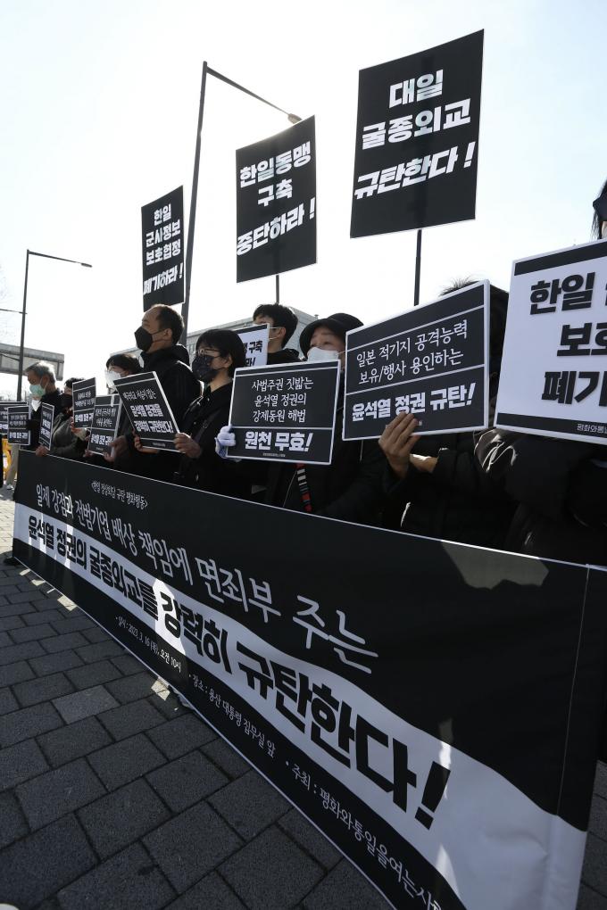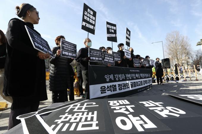 기자회견 참석자들은 "한일 정상회담은 일본 정부의 사죄와 전범 기업의 배상이라는 강제동원 피해자들의 요구를 철저히 외면하고 헌법정신과 대법원판결을 져버리며 일제의 불법 강점과 식민지배에 면죄부를 주는 '대일 항복문서'격인 윤석열 정권의 '제3자 변제' 해법에 이어, 대일 굴종외교의 정점이 될 것이 뻔하다"고 주장했다.