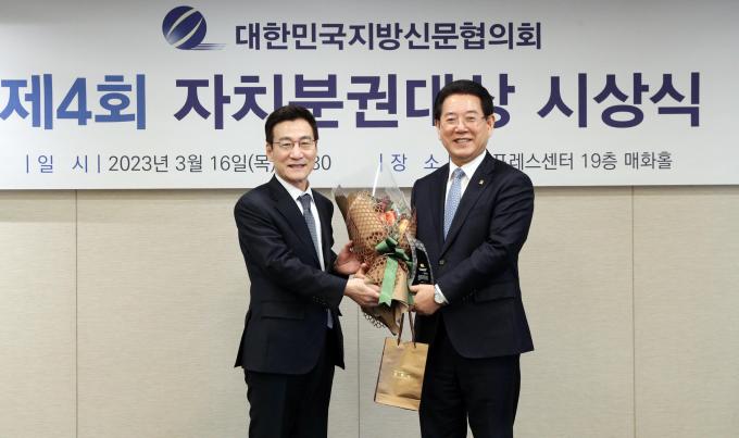 자치분권대상은 대한민국 자치분권의 조기 실현과 균형발전을 통해 지역 주민의 삶의 질 향상은 물론, 자치분권의 든든한 버팀목인 지역신문 발전에 기여한 단체장이나 정치인에게 수여한다.
