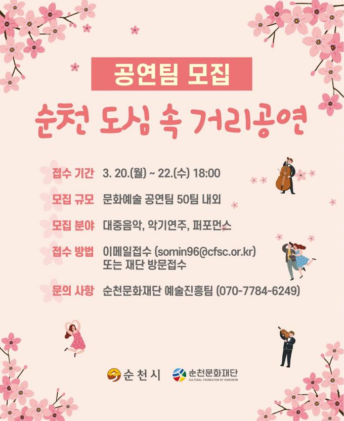 최종 선정된 공연팀은 집중 운영 기간인 4월과 5월 문화의거리, 순천역, 조례호수공원 등 도심 일원에서 시민들과 예술인, 그리고 관광객이 참여하고 함께 할 수 있는 문화예술 공연을 선보일 예정이다.
