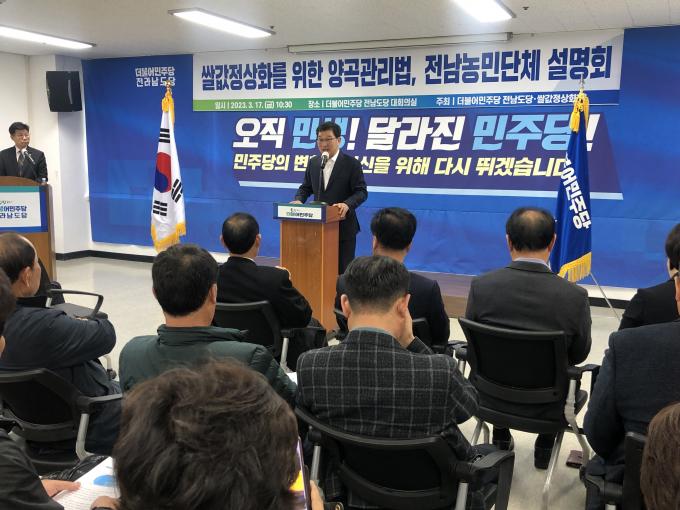 신정훈(나주·화순) 더불어민주당 전남도당위원장은 지난 17일 더불어민주당 전남도당에서 열린 '쌀값 정상화를 위한 양곡관리법 개정안'에 대한 전남농민단체 설명회에서 "정부가 지난해 역대 가장 많은 쌀에 대해 시장격리를 했음에도 쌀값은 오히려 떨어졌다"며 "쌀값이 이미 떨어진 뒤 시장격리를 하면 떨어진 쌀값은 다시 오르지 않는다. (정책 시행의) 시기가 중요하다"고 강조했다.