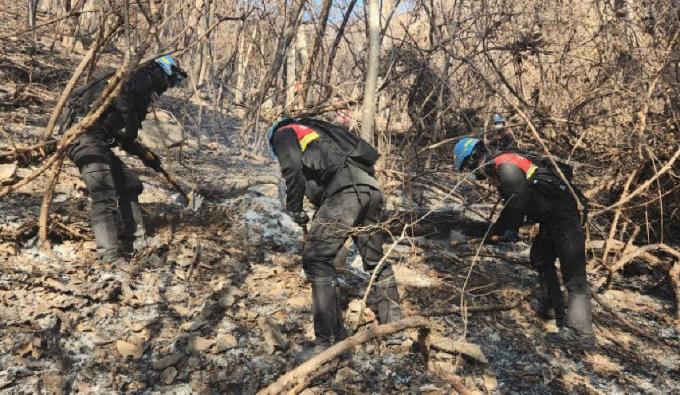 산림당국은 잔불이 되살아나는 경우에 대비하면서 피해 면적과 화재 원인 등을 조사하고 있다.