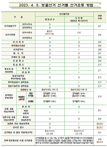 선거공약서는 창녕군수보궐선거에 한해 가족·선거사무장·선거사무원·회계책임자 및 활동보조인을 통해 배부할 수 있다. 선거운동용 현수막은 선거구안의 읍·면 수의 2배 이내로 가능하다.