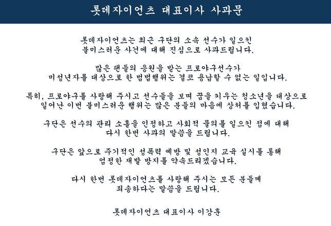 대표이사 명의로 구단 홈페이지에 올린 글에서는 "많은 팬들의 응원을 받는 프로야구 선수가 미성년자를 대상으로 한 범법 행위는 결코 용납할 수 없는 일"이라며 "선수 관리 소홀을 인정하고 사회적 물의를 일으킨 점에 대해 사과의 말씀을 드린다"고 전했다.
