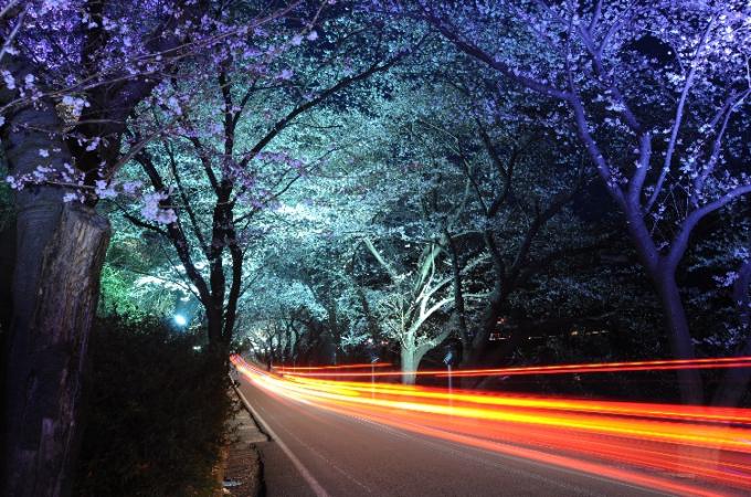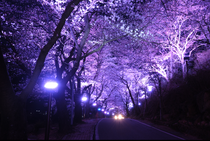 화개중학교 앞 양방향 구간에는 빨강·파랑·보라 등 형형색색으로 변화하는 아름다운 경관조명이 벚꽃터널과 어우러져 환상적인 분위기를 연출한다.