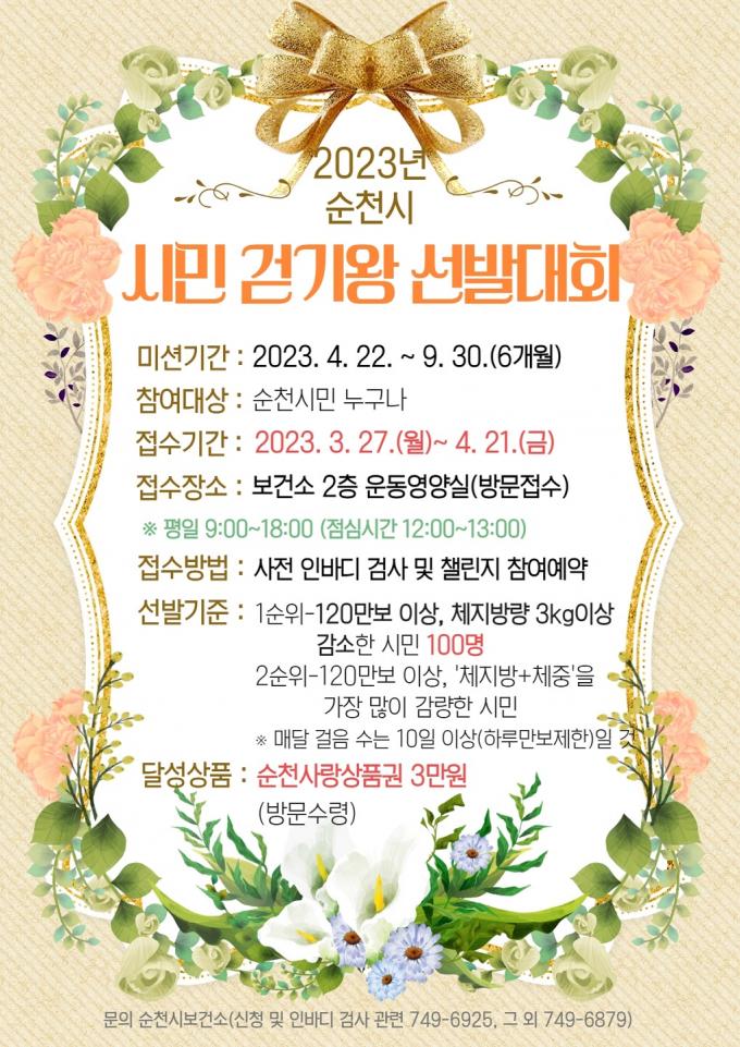 걷기왕에 도전을 원하는 시민은 핸드폰 어플인 '워크온'에서 순천시 커뮤니티에 가입하고 보건소 2층 운동영양실을 방문해 사전 인바디 검사 체지방 측정을 받아야 한다.