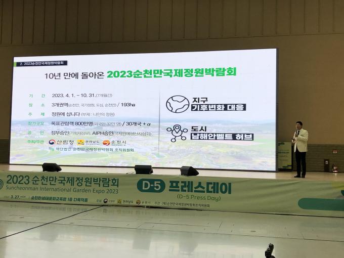 노관규 순천시장이 27일 열린 프레스데이 행사에서 지난 2013년 이후 10년만에 열리는 2023 순천만국제정원박람회장 의미를 이 말로 대신했다.