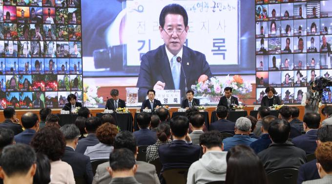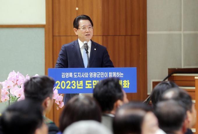 김영록 지사는 28일 영광군 국민체육센터 실내체육관에서 열린 '도민과의 대화'에서 "전국 최초로 청년발전기금 조성, 각종 평가에서 최우수 평가를 받는 등 변화와 혁신, 탁월한 군정으로 군민들로부터 신뢰를 받고 있는 강종만 영광군수와 공직자들께 감사의 말을 전한다"고 말했다.