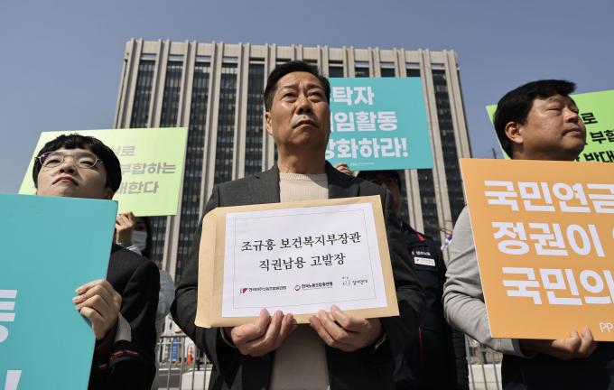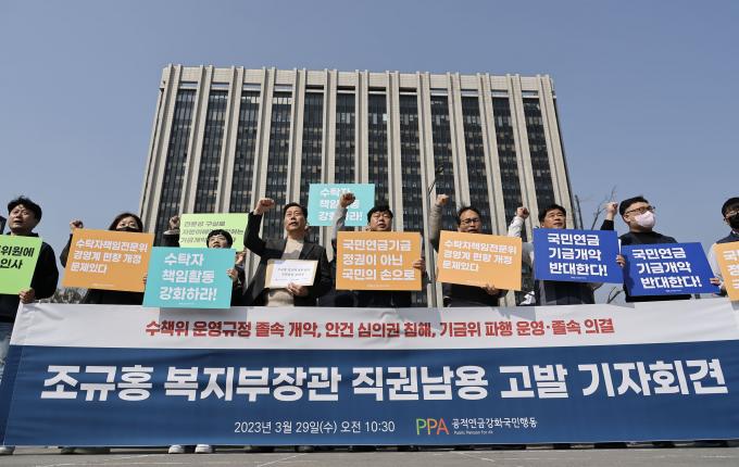 또한 "지난 3월 7일에 열린 제1차 기금위에서 조규홍 보건복지부 장관은 수탁자책임전문위원회의 인적 구성을 경영과 자본에 편향적으로 변경하는 의결 안건을 유례없이 표결로 강행 처리하고, 정당하게 문제를 제기하는 민주노총 추천 기금위원을 해촉했다"며 조 장관을 직권남용으로 고발한다고 밝혔다.