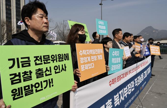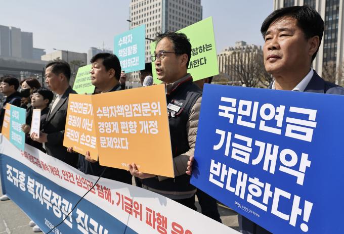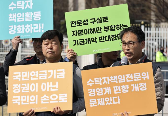 공적연금강화국민행동은 기자회견에서 "윤석열 정부는 수탁자 책임 활동을 관치로 격하시키고 있으며 상근전문위원에 검찰 출신 인사를 임명하고 노동계가 추천한 실무평가위원, 수탁자책임위원의 임명은 근거도 없이 거부하고 있다"며 "근거 없는 행정행위에 대한 비난을 피하기 위해 사후적으로 시행령 개정 등을 추진하는 등 파행을 거듭하고 있다"고 비판했다.