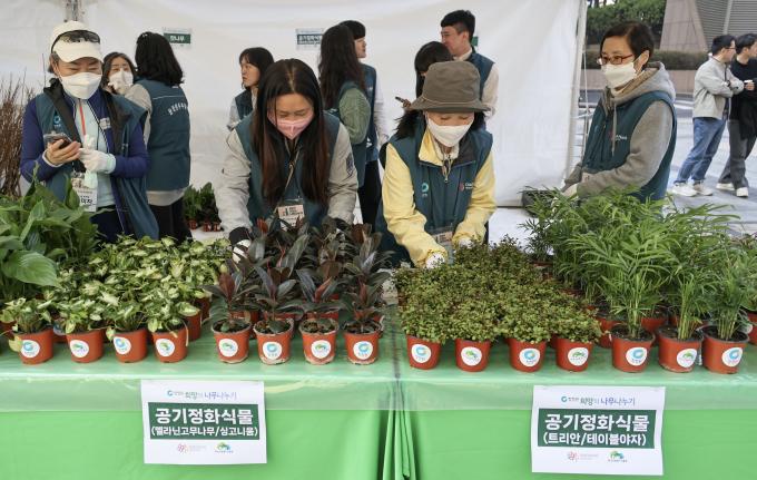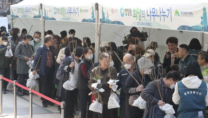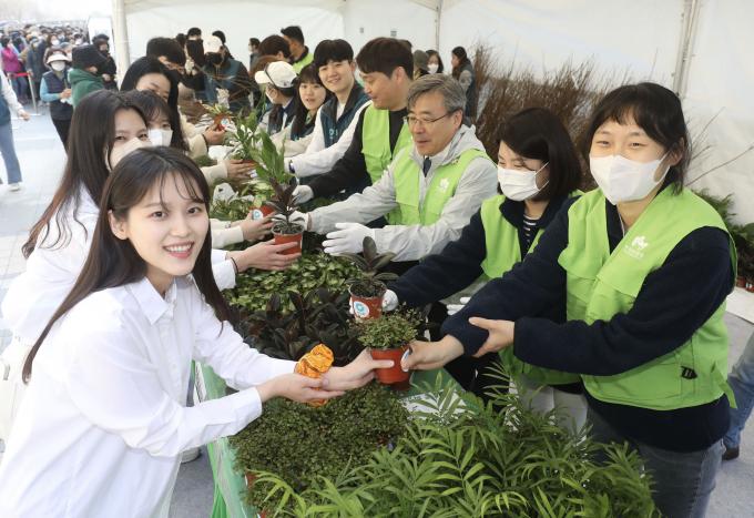 식목일을 앞두고 29일 오전 대상㈜ 청정원이 한국산림복지문화재단과 함께 서울 청계광장에서 '2023 희망의 나무 나누기' 행사를 진행했다.