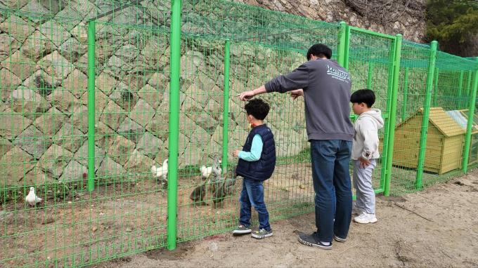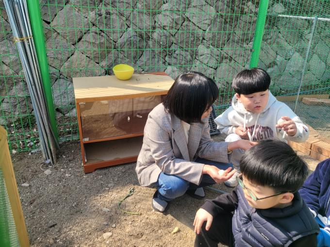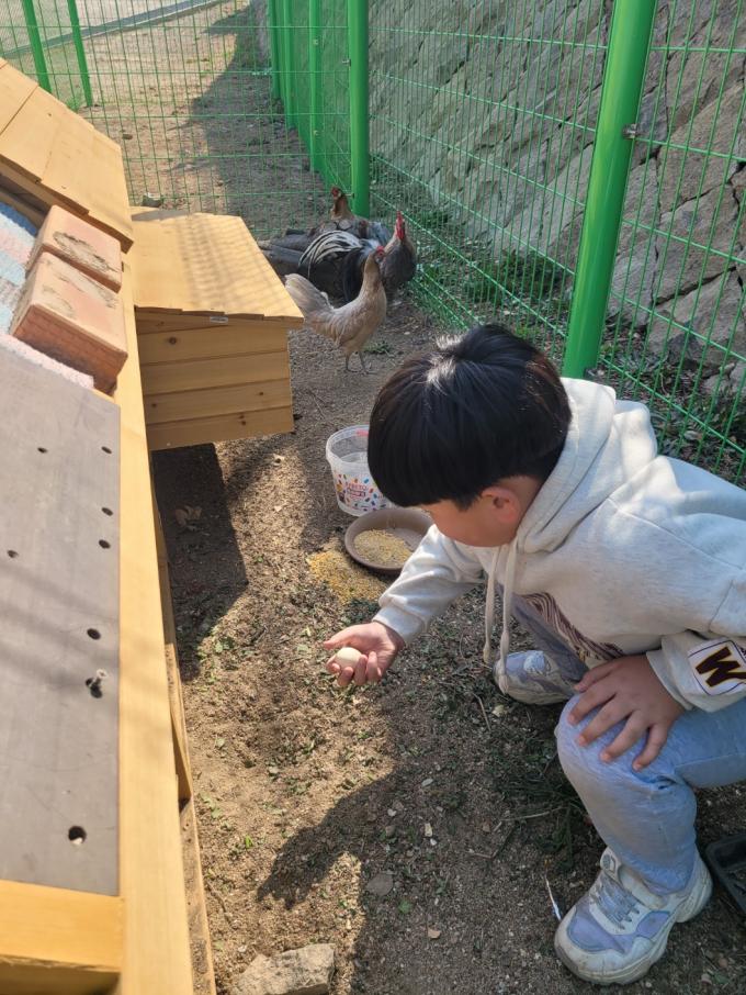 ▲30일 목포서산초 돌봄전담사와 학생들이 닭 사육장에서 '유정란'을 직접 만져보며 신기해 하고 있다. [목포서산초 제공] 목포서산초등학교가 체험 중심의 살아있는 교육을 위해 청계·오골계·토끼·거위·공작비둘기 등 6종류의 동물 사육장을 만들어 학생들에게 배움의 기회를 제공하고 있다. 동물이 6종류인 이유는 각 학년마다 한 가지의 동물을 보살핀다는 의미를 담고 있다.