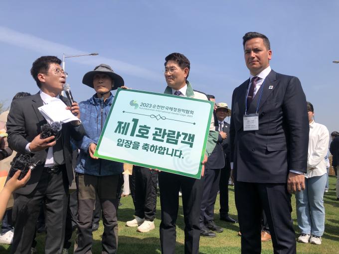 2023 순천만국가정원박람회가 1일 개막했다. 이날 열린 개장식에서 1호 입장객 '김시석' 씨는 전기간 관람권과 꽃다발을 받았다.