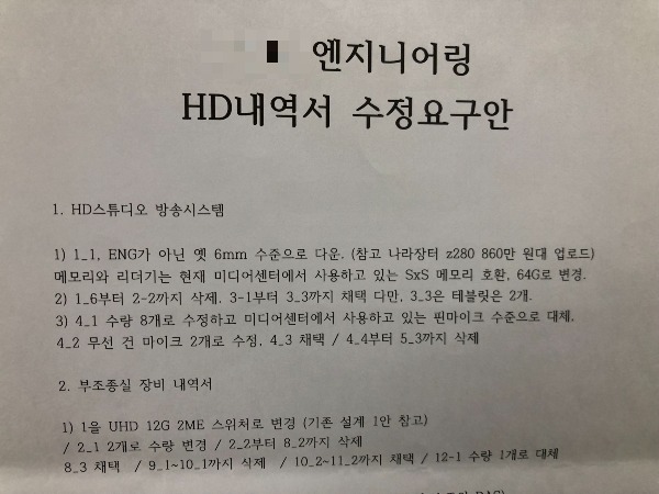이런 식으로 H업체는 3개월 동안 수차례에 걸쳐 설계안을 수정했지만 결국, 화면을 전환하는 스위처의 경우 Ross회사 제품, 카메라의 경우 캐논이나 파나소닉 등 전범 기업의 특정 업체 사양을 반영해 설계를 지연시킨 것으로 드러났다.