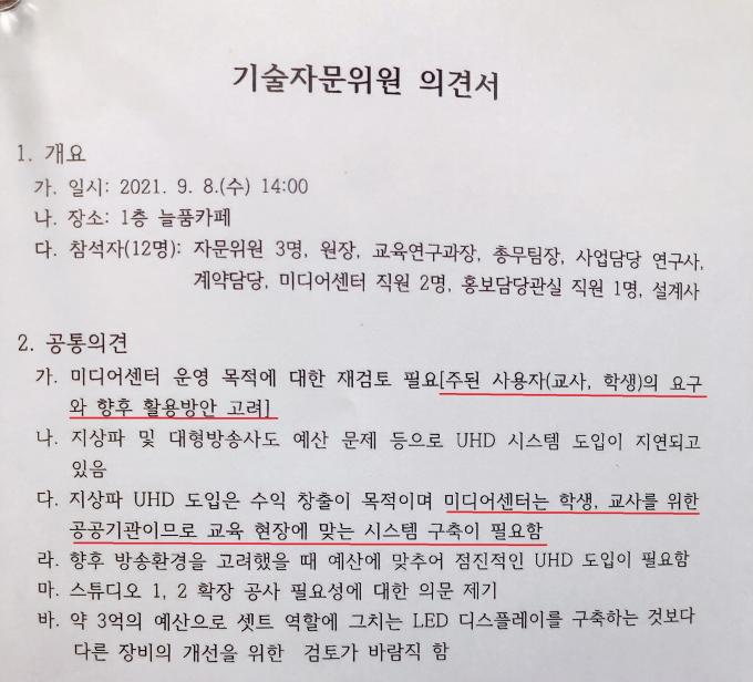 '예산 내에서 온전한 UHD가 가능'하다는 3개 회사 컨설팅 내용은 전달 받지 못한 채 가격 부풀리기 논란이 불거진 서울 H업체의 내용만 전달받고 자문의견서를 작성한 것이다.