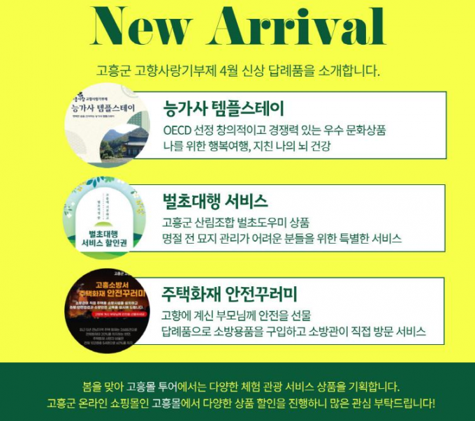 고흥군은 답례품으로 한우, 유자, 석류, 반건조 생선, 쌀 등 청정농수축산품 380여종과 고흥사랑상품권, 분청사기를 제공하고 있으며, 이번 신규 답례품인 능가사 템플스테이, 벌초대행서비스, 주택화재안전꾸러미도 4월부터 본격 제공할 예정이다.