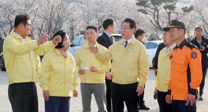 ▲3일 김영록 전라남도지사가 함평군 대동면 연암리 야산에서 발생한 현장을 방문, 산불현장 지휘본부에서 영암국유림관리소 심양수 소장으로부터 산불진화 현황에 대해 설명을 듣고 있다. [전남도 제공]