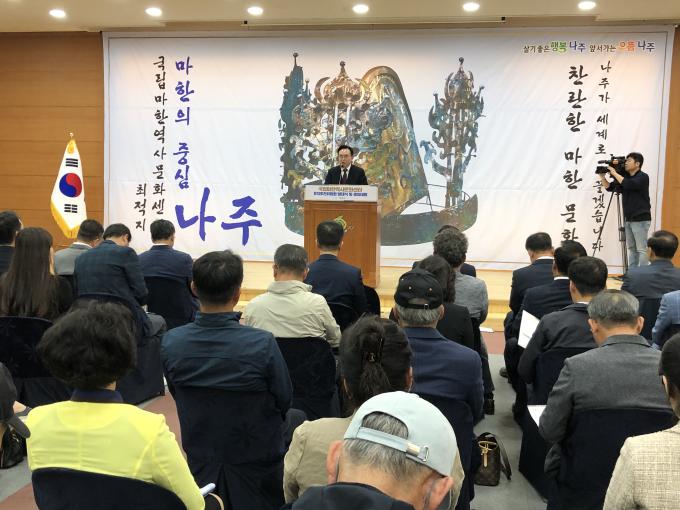 ▲ 4일 윤병태 나주시장이 국립마한역사문화센터 발대식 및 결의대회에 참석해 마한의 중심지인 나주에 '국립마한역사문화센터'가 유치돼야 한다고 강조하고 있다. [강성명 기자]