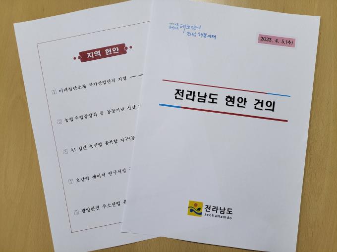 주요 건의 사업은 △남해안 종합개발청 설립 △미래첨단소재 국가산업단지 지정 △농협·수협중앙회 등 공공기관 전남 이전 △인공지능(AI) 첨단 농산업 융복합지구(농생명 밸리) 조성 △초강력 레이저 연구시설 구축 △광양만권 수소산업 융복합 플랫폼 구축 등이다.