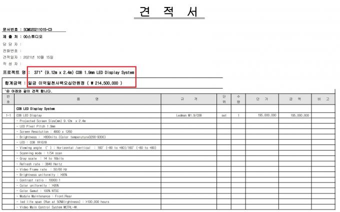 "LED 비디오 월의 경우도 4억 원이 아닌 2억 원 초반이면 구매가 가능하다며 발열이나 정전기·모아레현상이 적고 가격도 큰 차이가 없는 COB방식을 채택하는 게 대부분인데 왜 SMD방식을 채택했는지 모르겠다"고 덧붙였다.