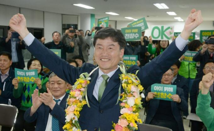 천 후보는 6일 오전 1시 현재 개표가 86% 진행된 상황에서 63.12%(13만3906표)의 득표율을 기록, 36.87%(7만8225표)에 그친 보수 성향 김주홍 후보를 큰 격차로 당선을 확정지었다.