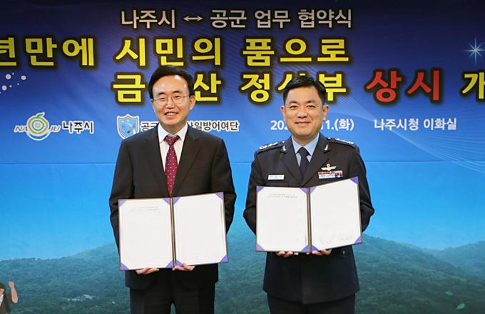또 "나주의 진산인 금성산 정상부를 56년 만에 시민의 품으로 돌려 드리는 역사적인 협약을 체결해 뜻깊고 기쁘다"며 "공군과의 적극적인 공조와 협력을 통해 올해 산 정상부 상시 개방을 위한 협약 이행에 속도를 내겠다"고 말했다.