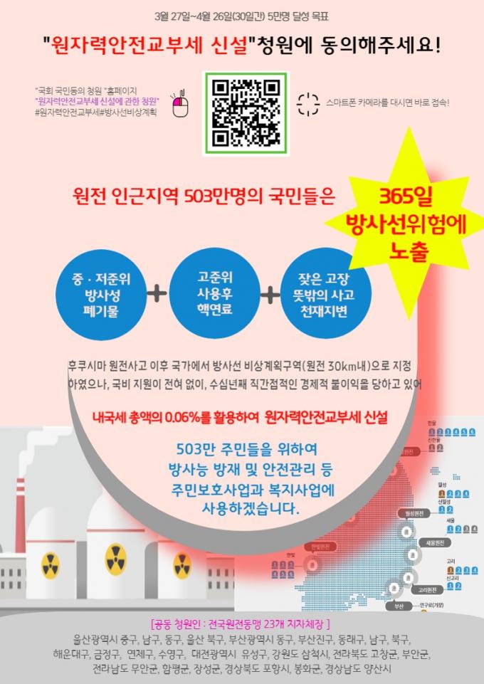 청원 동의 참여 방법은 국회 국민동의 청원 누리집이나 홍보물 QR코드에 접속해 '원자력안전교부세 신설에 관한 청원'을 선택하고 본인인증 후 동의하면 된다.