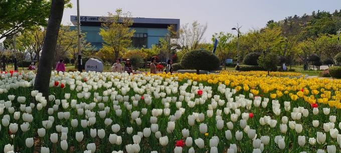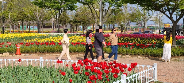 ▲ 13일 전남 목포시 김대중 노벨평화상 기념관 인근의 삼학도 중앙공원에 형형색색의 튤립이 만발해 시민들이 따스한 봄 햇살을 즐기며 걷고 있다. [독자 고규석 제공]