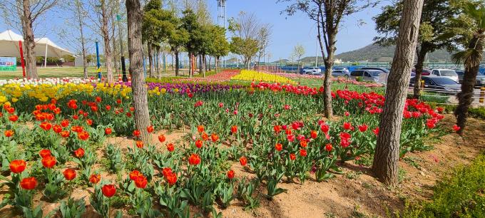 ▲ 13일 전남 목포시 김대중 노벨평화상 기념관 인근의 삼학도 중앙공원에 형형색색의 튤립이 만발했다. [독자 고규석 제공]