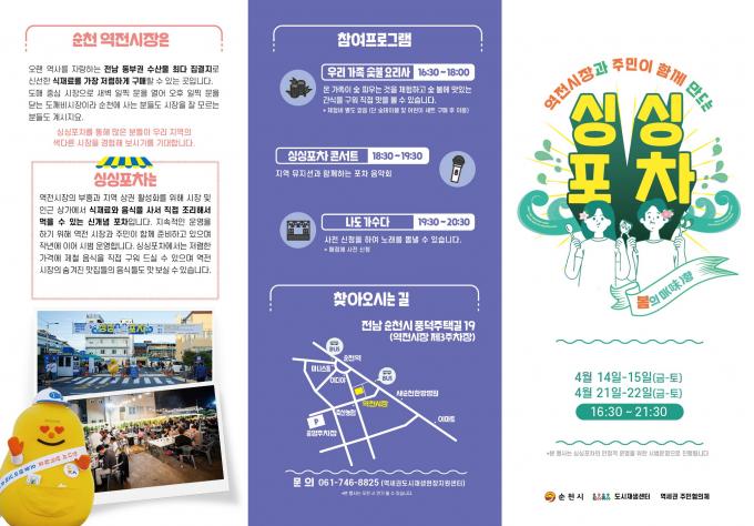 싱싱포차는 전남 동부권 수산물 최다 집결지로서, 신선한 식재료를 가장 저렴하게 구매할 수 있는 역전시장의 장점을 살린 축제로 2019년부터 진행해 올해 4회째를 맞는 지역 대표 수산물 축제다. 주꾸미, 바지락, 키조개, 도다리, 소라 등 순천의 제철 먹거리를 골고루 맛볼 수 있다.