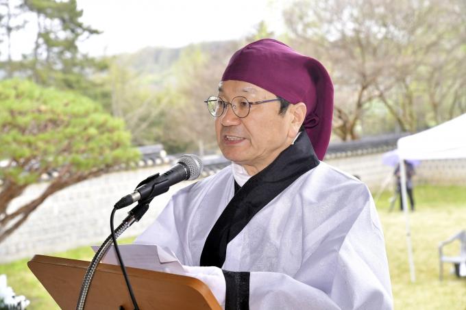 ▲강기정 광주광역시장이 14일 포충사에서 열린 '제431주기 충렬공 제봉 고경명 선생 제향행사'에 참석해 추모사를 하고 있다. [광주광역시 제공]