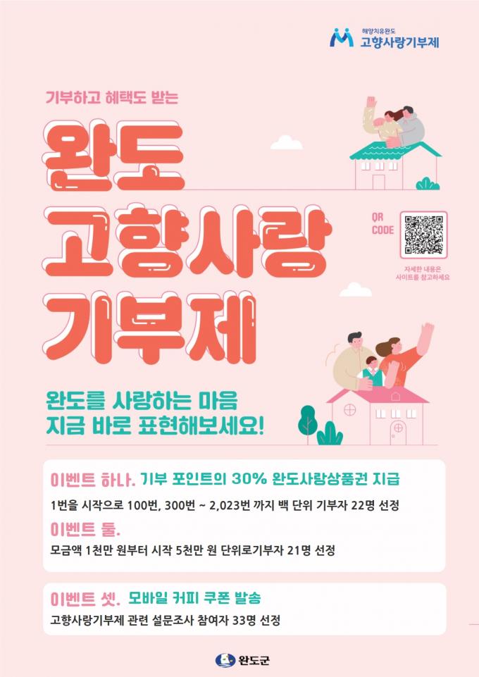 '삼삼한 완도사랑'은 우리 군에 고향사랑기부금을 기부한 사람 가운데 '고향사랑e음' 포털을 통해 특정 순번과 모금액 달성자에게 완도사랑상품권을 경품으로 주는 이벤트다.