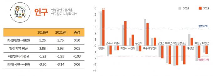 이에따르면 2018년도 대비 2021년 기준, 천안·아산·서산·당진 등을 중심으로 한 북부권은 인구 증가와 소득 확대 등이 두드러졌으나 서천·청양·부여·금산 등 저발전지역은 상대적으로 인구·재정·소득 분야에서 낙후된 것으로 분석됐다.