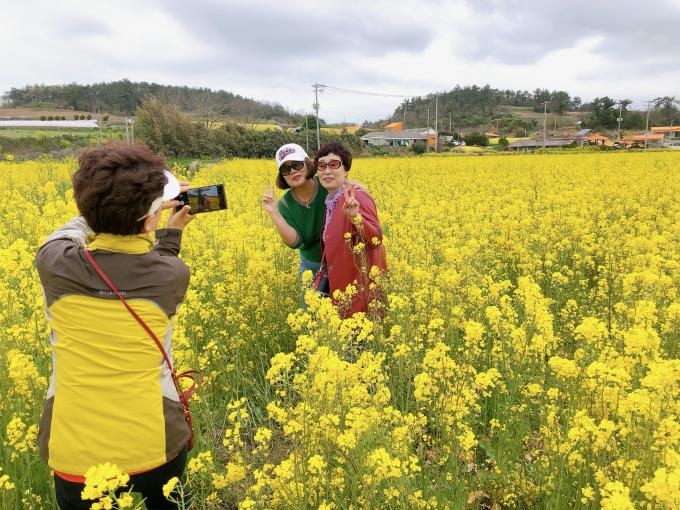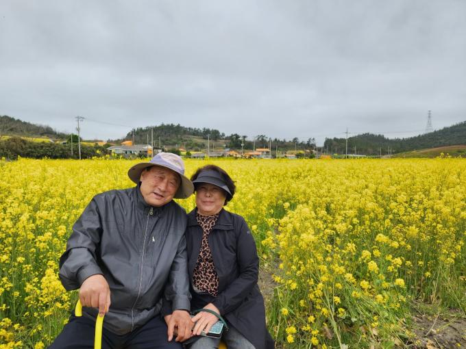 ▲ 15일 목포에서 나들이 나온 우영진 부부가 신안 '팔금 섬 유채꽃 축제' 현장에서 유채꽃을 배경으로 추억을 남기고 있다. [강성명 기자]