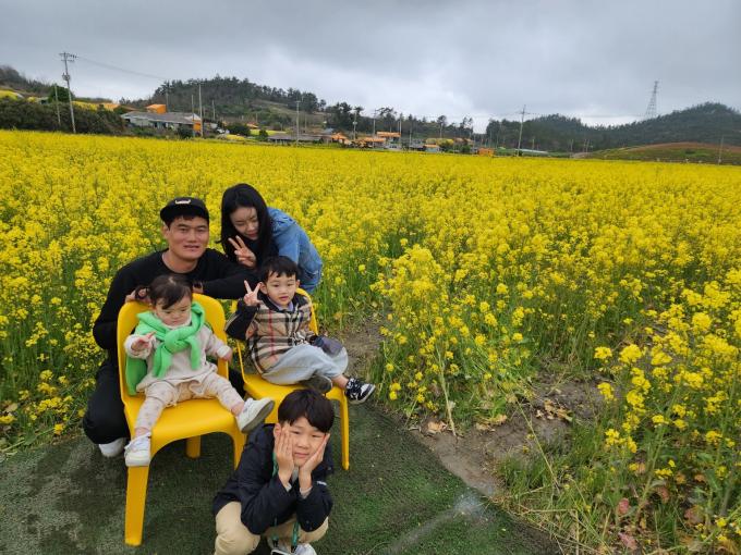 ▲15일 목포에서 나들이 나온 박승완 가족들이 신안 '팔금 섬 유채꽃 축제' 현장에서 유채꽃을 배경으로 추억 사진을 남기고 있다. [강성명 기자]