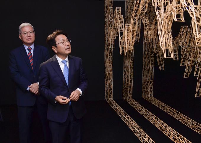 ▲15일 강기정 광주광역시장이 동구 은암미술관에 전시중인 제14회 광주비엔날레 중국 파빌리온을 찾아 장청강 주광주 중국총영사와 작품을 관람하고 있다. [광주광역시 제공]
